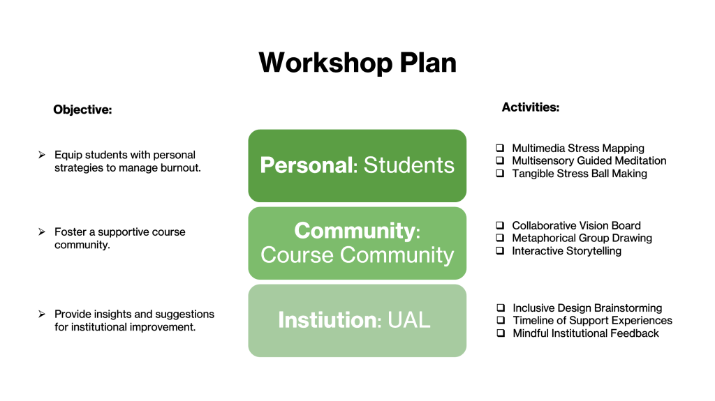 The preference for specific language in the interview informs a thoughtful approach to language use in the focus group. Knowing that burnout is a big issue in higher education guides our focus group discussions to explore the specific challenges UAL students face and find out what might be causing burnout. Talking about inclusive design for assessments means the focus group should use various mediums/formats for students to share their thoughts. The focus group is a place for participants to tell us how well current support is working and suggest ways to make it better. Bringing in insights from the interview gives us a complete view in the focus group, looking at individual experiences and how things are at UAL overall. This way of doing things matches with what I learned about the organisational side of burnout in the literature review.
